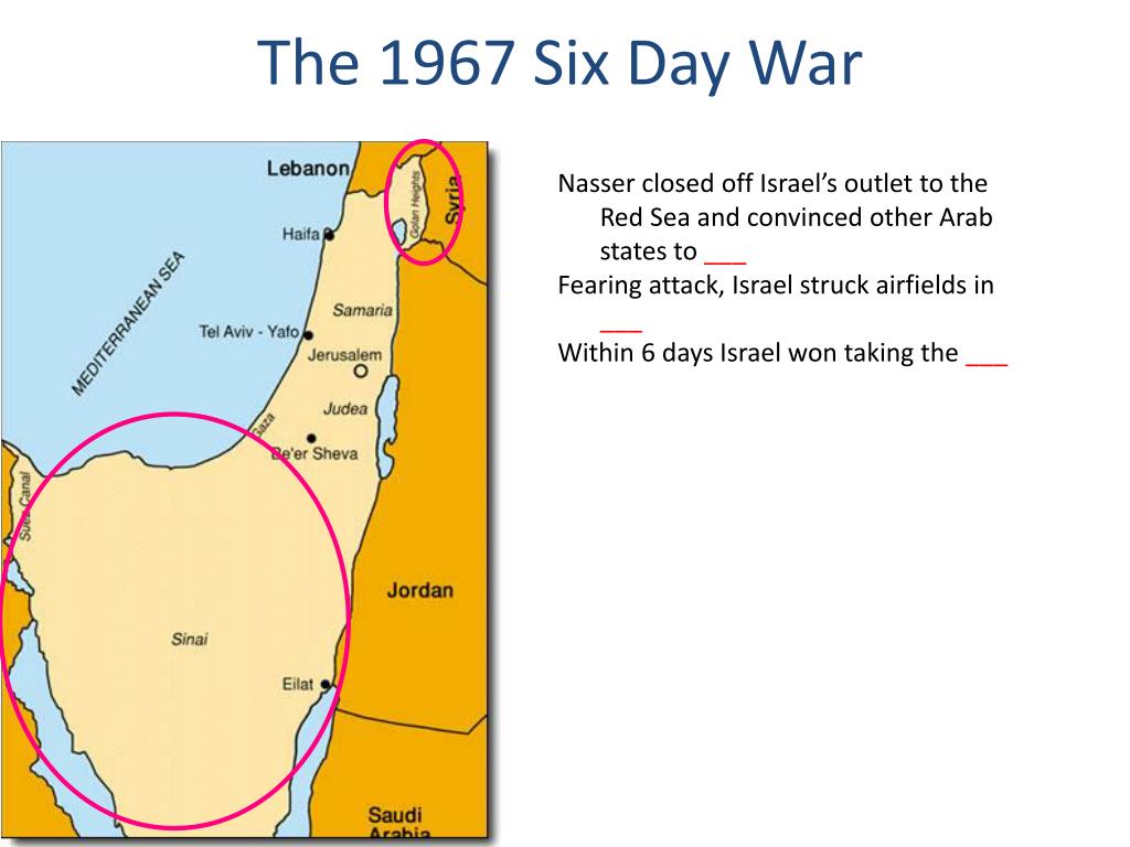 The 1967 Six Day War Nasser closed off Israel’s outlet to the Red Sea and convinced other Arab states to ___ Fearing attack, Israel struck airfields in ___ Within 6 days Israel won taking the ___