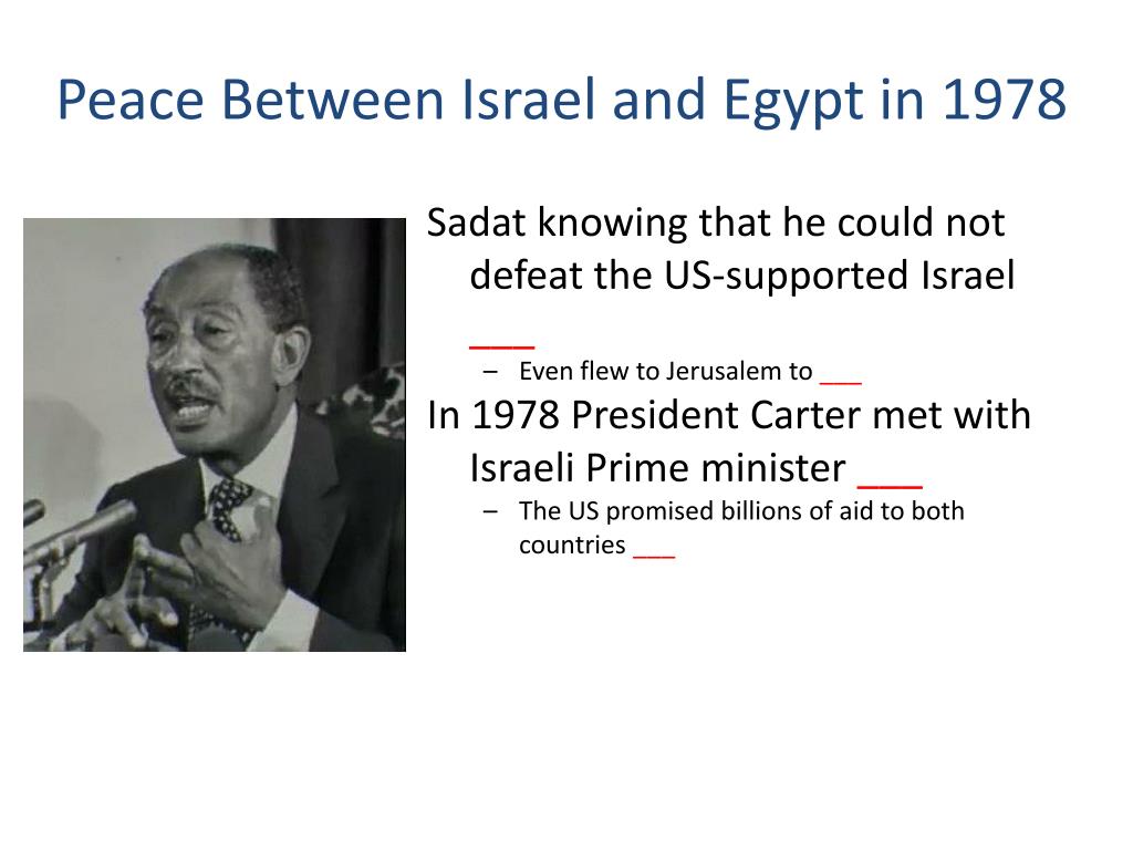 Peace Between Israel and Egypt in 1978 • Sadat knowing that he could not defeat the US-supported Israel ___ • Even flew to Jerusalem to ___ • In 1978 President Carter met with Israeli Prime minister ___ • The US promised billions of aid to both countries ___