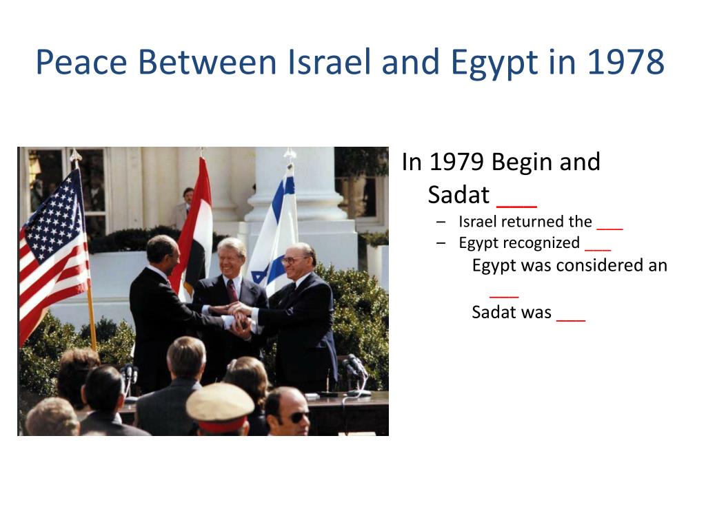Peace Between Israel and Egypt in 1978 • In 1979 Begin and Sadat ___ • Israel returned the ___ • Egypt recognized ___ • Egypt was considered an ___ • Sadat was ___