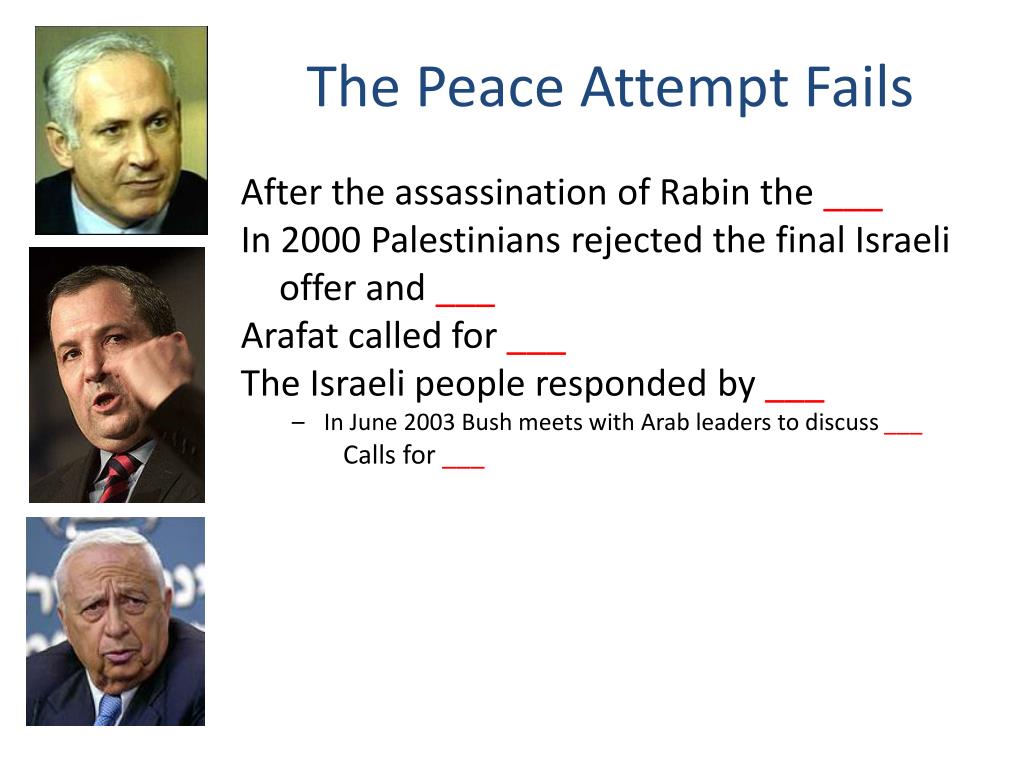 The Peace Attempt Fails • After the assassination of Rabin the ___ • In 2000 Palestinians rejected the final Israeli offer and ___ • Arafat called for ___ • The Israeli people responded by ___ • In June 2003 Bush meets with Arab leaders to discuss ___ • Calls for ___
