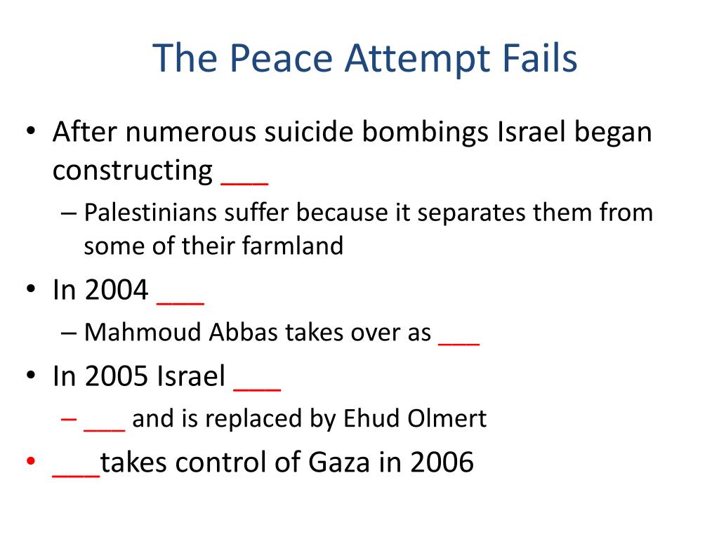 The Peace Attempt Fails • After numerous suicide bombings Israel began constructing ___ • Palestinians suffer because it separates them from some of their farmland • In 2004 ___ • MahmoudAbbas takes over as ___ • In 2005 Israel ___ • ___ and is replaced by Ehud Olmert • ___takes control of Gaza in 2006