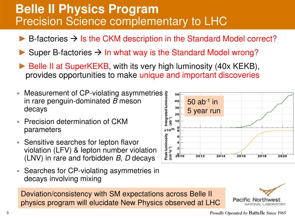 Belle II Physics ProgramPrecision Science complementary to LHC • Measurement of CP-violating asymmetries in rare penguin-dominated B meson decays • Precision determination of CKM parameters • Sensitive searches for lepton flavor violation (LFV) & lepton number violation (LNV) in rare and forbidden B, D decays • Searches for CP-violating asymmetries in decays involving mixing 50 ab-1 in5 year run Deviation/consistency with SM expectations across Belle II physics program will elucidate New Physics observed at LHC • B-factories Is the CKM description in the Standard Model correct? • Super B-factories In what way is the Standard Model wrong? • Belle II at SuperKEKB, with its very high luminosity (40x KEKB), provides opportunities to make unique and important discoveries