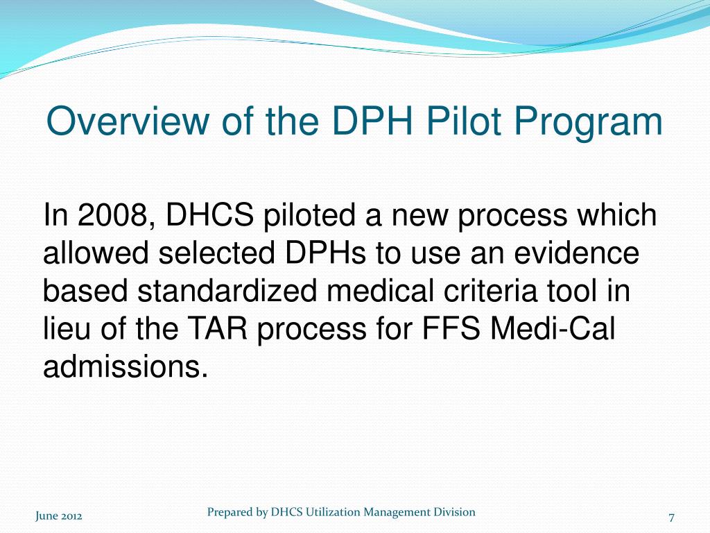 Overview of the DPH Pilot Program In 2008, DHCS piloted a new process which allowed selected DPHs to use an evidence based standardized medical criteria tool in lieu of the TAR process for FFS Medi-Cal admissions. Prepared by DHCS Utilization Management Division