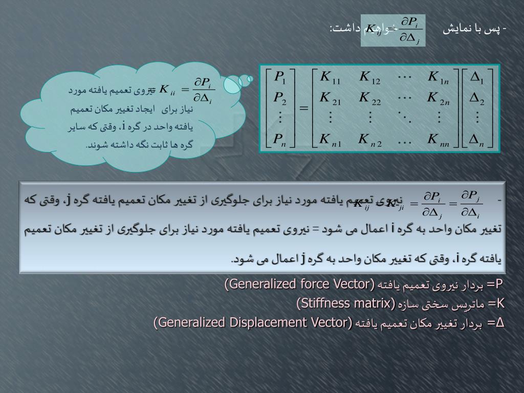 - پس با نمایش خواهیم داشت: نیروی تعمیم یافته مورد نیاز برای ایجاد تغییر مکان تعمیم یافته واحد در گره i، وقتی که سایر گره ها ثابت نگه داشته شوند. - درنتیجه معادله معروف و مشهور روش سختی به دست می آید: =P بردار نیروی تعمیم یافته (Generalized force Vector) =K ماتریس سختی سازه (Stiffness matrix) =Δبردار تغییر مکان تعمیم یافته (Generalized Displacement Vector) -نیروی تعمیم یافته مورد نیاز برای جلوگیری از تغییر مکان تعمیم یافته گره j، وقتی که تغییر مکان واحد به گره i اعمال می شود = نیروی تعمیم یافته مورد نیاز برای جلوگیری از تغییر مکان تعمیم یافته گره i، وقتی که تغییر مکان واحد به گره j اعمال می شود.