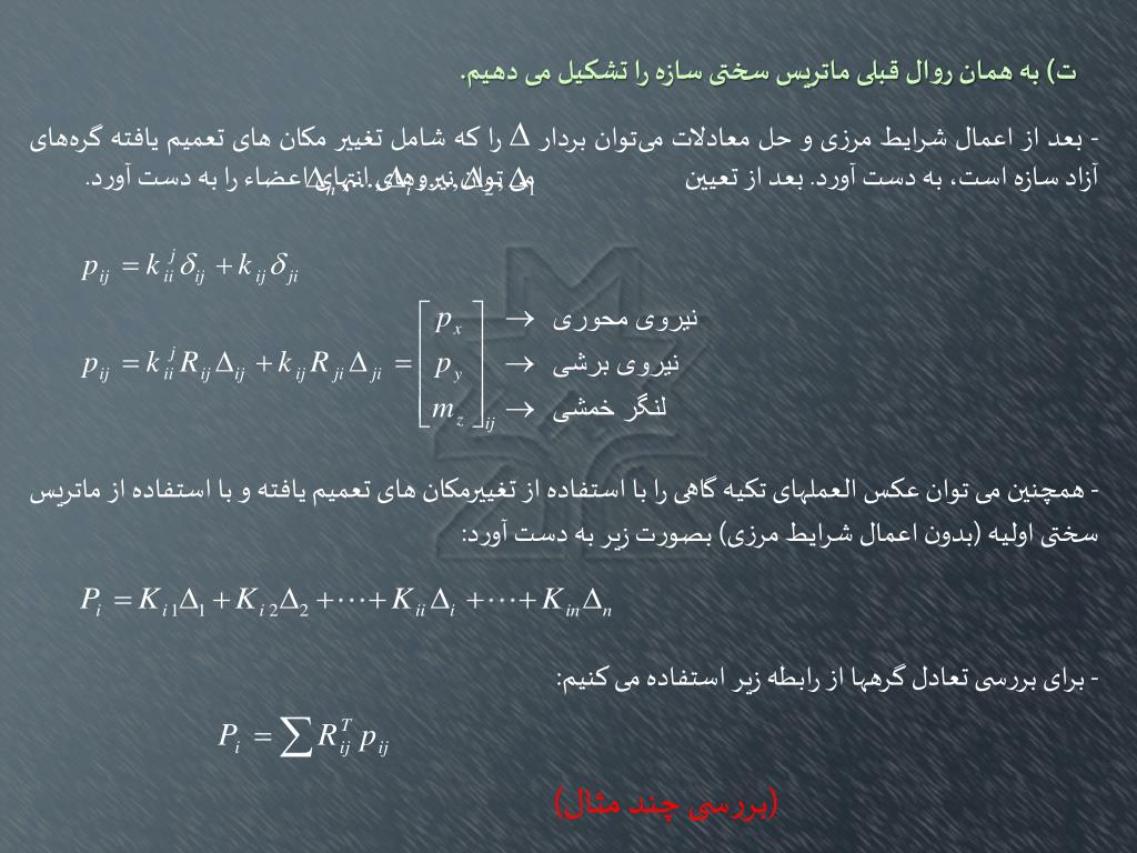 ت) به همان روال قبلی ماتریس سختی سازه را تشکیل می دهیم. - بعد از اعمال شرایط مرزی و حل معادلات میتوان بردار ∆ را که شامل تغییر مکان های تعمیم یافته گرههای آزاد سازه است، به دست آورد. بعد از تعیین می توان نیروهای انتهای اعضاء را به دست آورد. نیروی محوری نیروی برشی لنگر خمشی • - همچنین می توان عکس العملهای تکیه گاهی را با استفاده از تغییرمکان های تعمیم یافته و با استفاده از ماتریس سختی اولیه (بدون اعمال شرایط مرزی) بصورت زیر به دست آورد: • - برای بررسی تعادل گرهها از رابطه زیر استفاده می کنیم: (بررسی چند مثال)