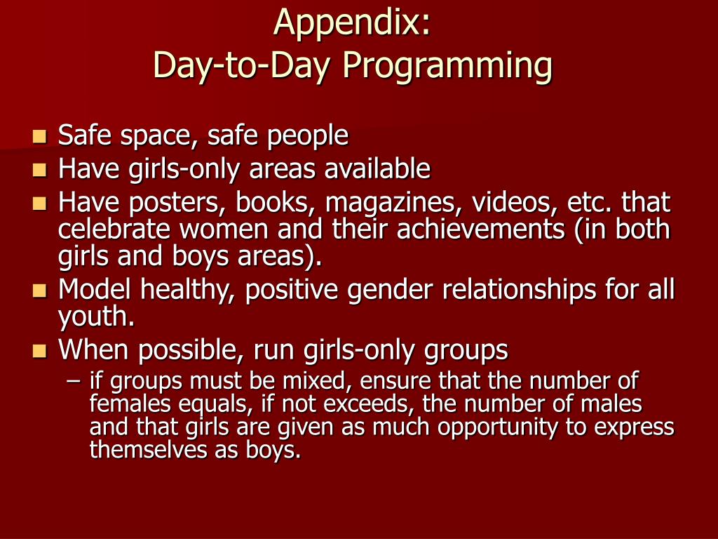Appendix:Day-to-Day Programming • Safe space, safe people • Have girls-only areas available • Have posters, books, magazines, videos, etc. that celebrate women and their achievements (in both girls and boys areas). • Model healthy, positive gender relationships for all youth. • When possible, run girls-only groups • if groups must be mixed, ensure that the number of females equals, if not exceeds, the number of males and that girls are given as much opportunity to express themselves as boys.