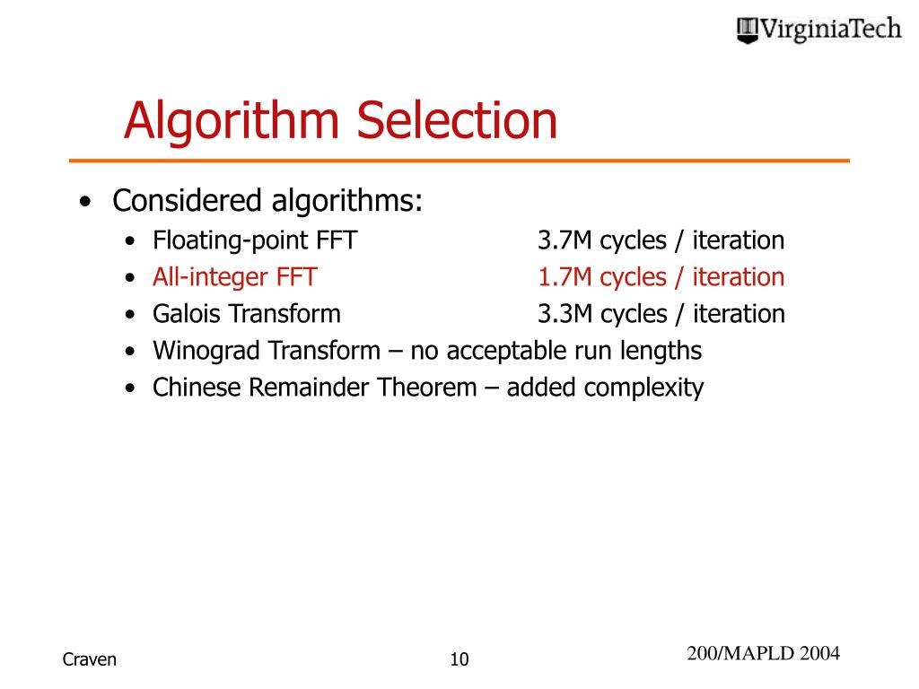 Algorithm Selection • Considered algorithms: • Floating-point FFT 3.7M cycles / iteration • All-integer FFT 1.7M cycles / iteration • Galois Transform 3.3M cycles / iteration • Winograd Transform – no acceptable run lengths • Chinese Remainder Theorem – added complexity Craven