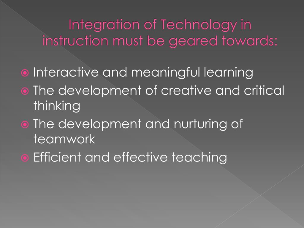 Integration of Technology in instruction must be geared towards: • Interactive and meaningful learning • The development of creative and critical thinking • The development and nurturing of teamwork • Efficient and effective teaching