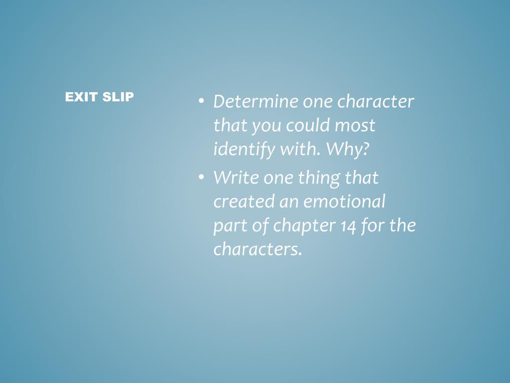 Determine one character that you could most identify with. Why? • Write one thing that created an emotional part of chapter 14 for the characters. Exit slip