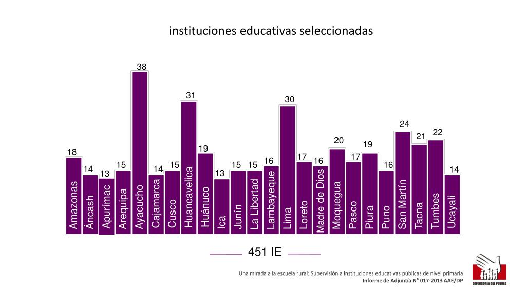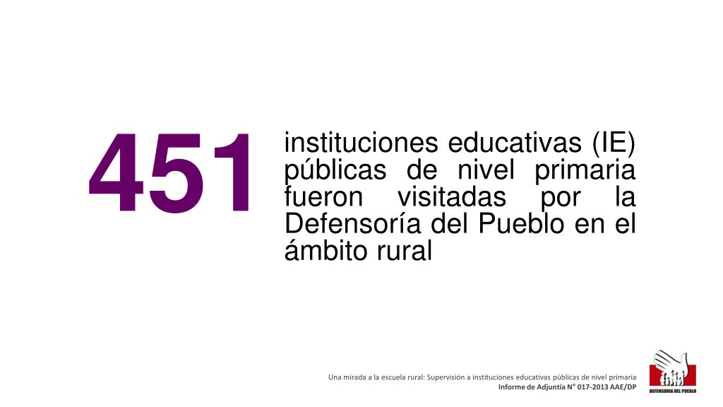 451 instituciones educativas (IE) públicas de nivel primaria fueron visitadas por la Defensoría del Pueblo en el ámbito rural Una mirada a la escuela rural: Supervisión a instituciones educativas públicas de nivel primaria Informe de Adjuntía N° 017-2013 AAE/DP