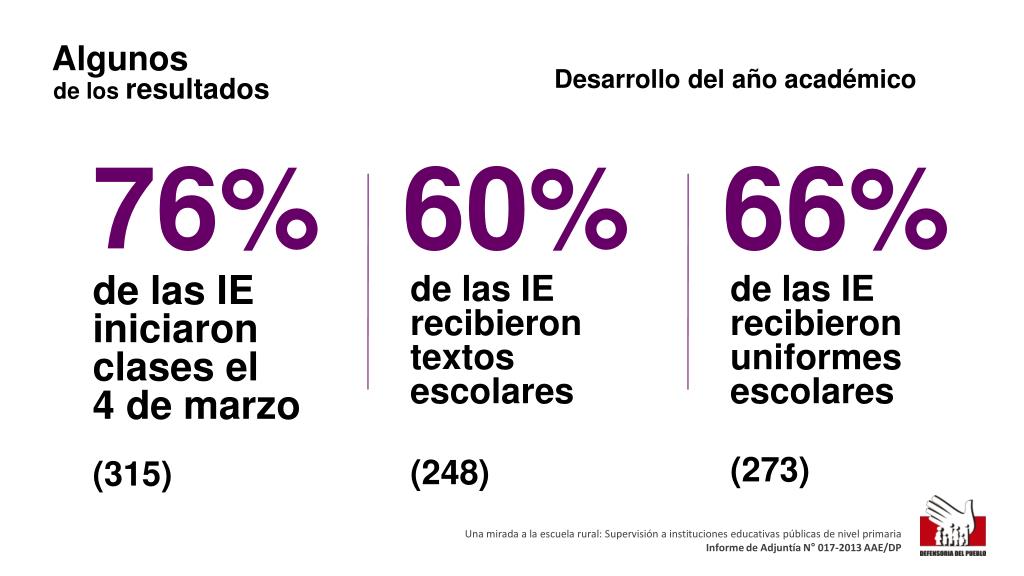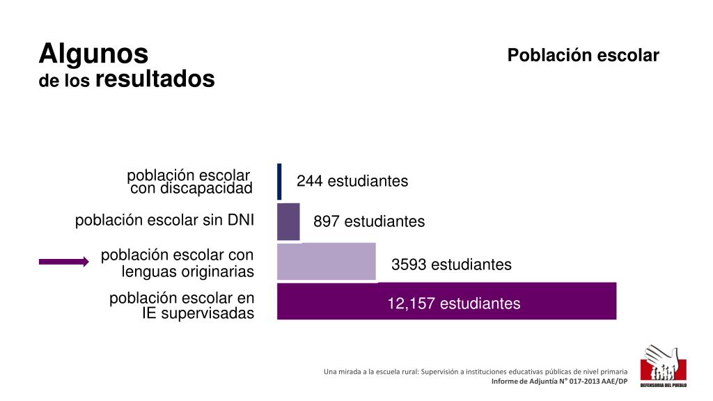 Algunos de los resultados Población escolar población escolar con 244 estudiantes lenguas originarias población escolar sin DNI población escolar 897 estudiantes con discapacidad población escolar en 3593 estudiantes IE supervisadas 12,157 estudiantes Una mirada a la escuela rural: Supervisión a instituciones educativas públicas de nivel primaria Informe de Adjuntía N° 017-2013 AAE/DP