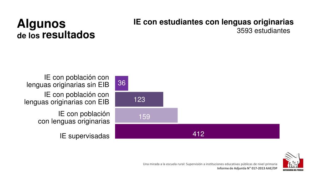 Algunos de los resultados IE con estudiantes con lenguas originarias 3593 estudiantes IE con población con IE con población con 36 lenguas originarias sin EIB lenguas originarias con EIB 123 IE con población 159 con lenguas originarias 412 IE supervisadas Una mirada a la escuela rural: Supervisión a instituciones educativas públicas de nivel primaria Informe de Adjuntía N° 017-2013 AAE/DP