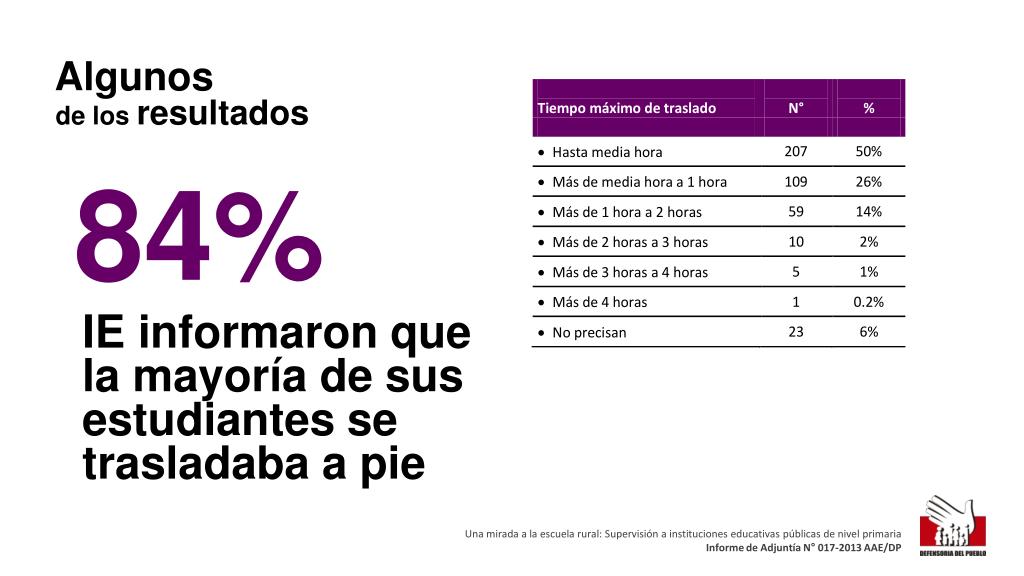 Algunos de los resultados 84% IE informaron que la mayoría de sus estudiantes se trasladaba a pie Una mirada a la escuela rural: Supervisión a instituciones educativas públicas de nivel primaria Informe de Adjuntía N° 017-2013 AAE/DP