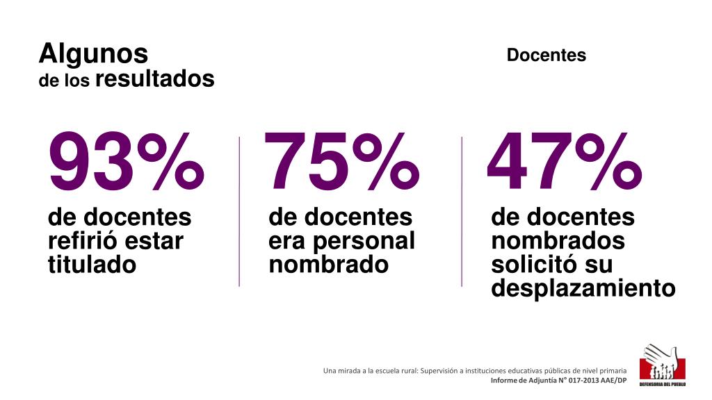 Algunos de los resultados Docentes 75% 47% 93% de docentes era personal nombrado de docentes nombrados solicitó su desplazamiento de docentes refirió estar titulado Una mirada a la escuela rural: Supervisión a instituciones educativas públicas de nivel primaria Informe de Adjuntía N° 017-2013 AAE/DP