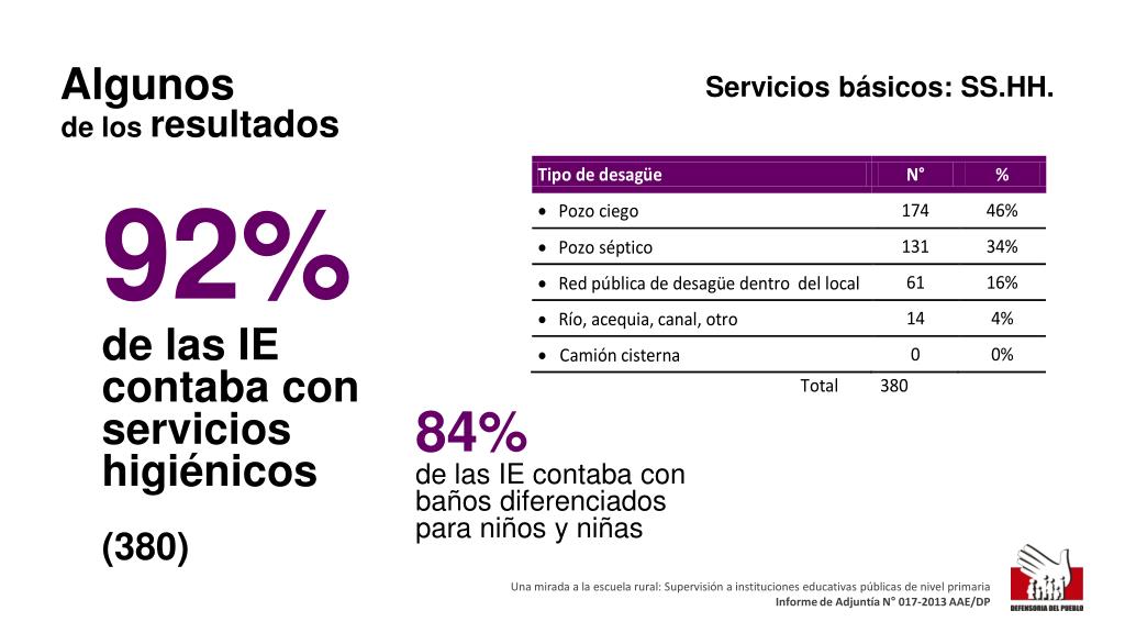 Algunos de los resultados Servicios básicos: SS.HH. 92% de las IE contaba con servicios higiénicos (380) 84% de las IE contaba con baños diferenciados para niños y niñas Una mirada a la escuela rural: Supervisión a instituciones educativas públicas de nivel primaria Informe de Adjuntía N° 017-2013 AAE/DP