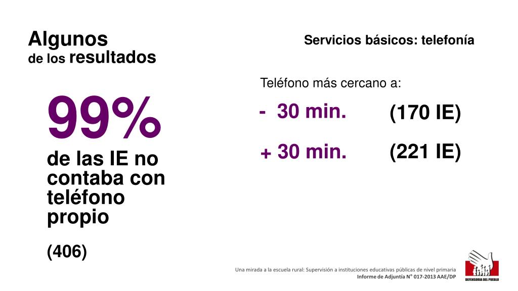 Algunos de los resultados Servicios básicos: telefonía Teléfono más cercano a: 99% (170 IE) - 30 min. (221 IE) + 30 min. de las IE no contaba con teléfono propio (406) Una mirada a la escuela rural: Supervisión a instituciones educativas públicas de nivel primaria Informe de Adjuntía N° 017-2013 AAE/DP