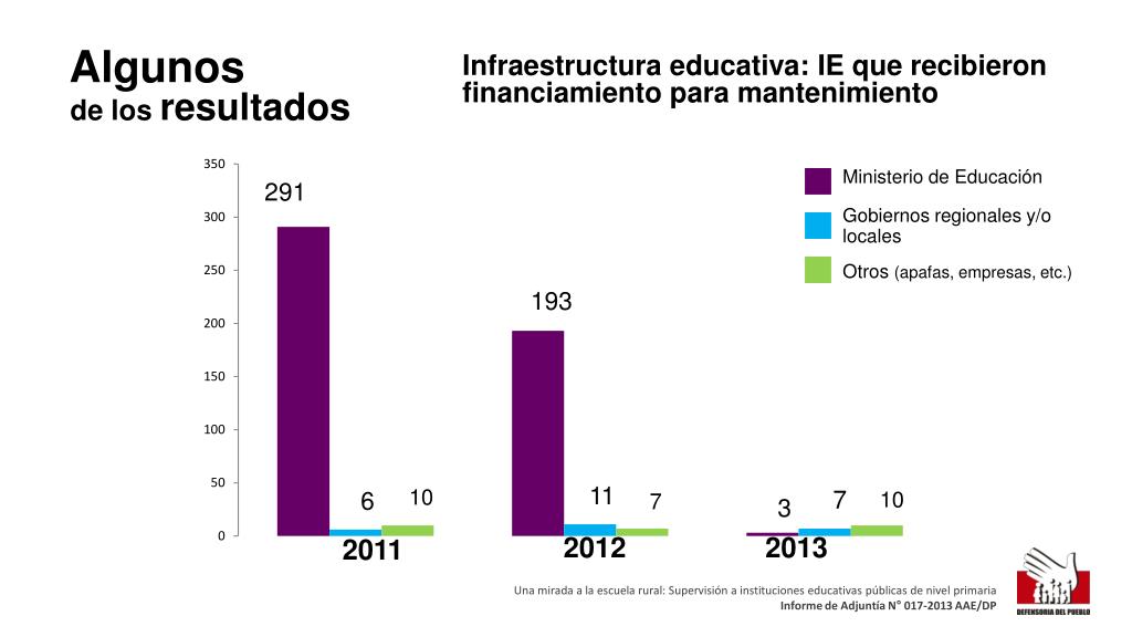 Algunos de los resultados Infraestructura educativa: IE que recibieron financiamiento para mantenimiento Ministerio de Educación Gobiernos regionales y/o locales Otros (apafas, empresas, etc.) 2012 2013 2011 Una mirada a la escuela rural: Supervisión a instituciones educativas públicas de nivel primaria Informe de Adjuntía N° 017-2013 AAE/DP