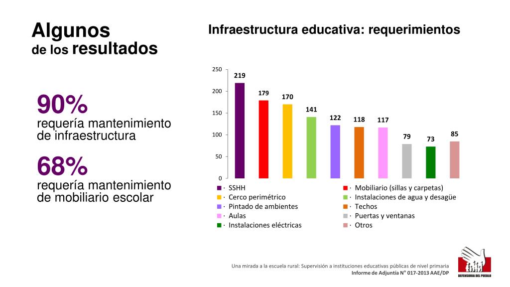 Algunos de los resultados Infraestructura educativa: requerimientos 90% requería mantenimiento de infraestructura 68% requería mantenimiento de mobiliario escolar Una mirada a la escuela rural: Supervisión a instituciones educativas públicas de nivel primaria Informe de Adjuntía N° 017-2013 AAE/DP