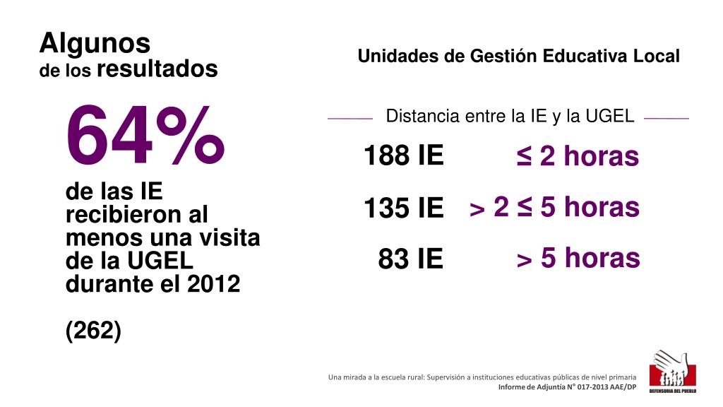 Algunos de los resultados Unidades de Gestión Educativa Local 64% Distancia entre la IE y la UGEL 188 IE ≤ 2 horas de las IE recibieron al menos una visita de la UGEL durante el 2012 (262) 135 IE > 2 ≤ 5 horas 83 IE > 5 horas Una mirada a la escuela rural: Supervisión a instituciones educativas públicas de nivel primaria Informe de Adjuntía N° 017-2013 AAE/DP