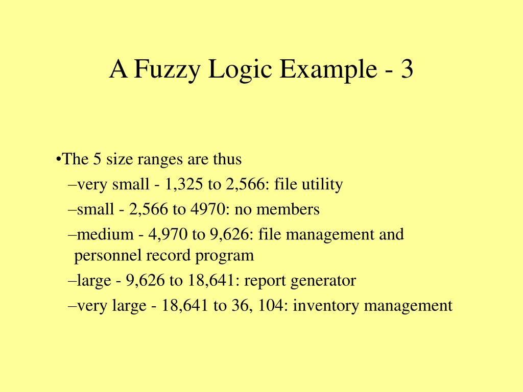 A Fuzzy Logic Example - 3 • The 5 size ranges are thus • very small - 1,325 to 2,566: file utility • small - 2,566 to 4970: no members • medium - 4,970 to 9,626: file management and personnel record program • large - 9,626 to 18,641: report generator • very large - 18,641 to 36, 104: inventory management