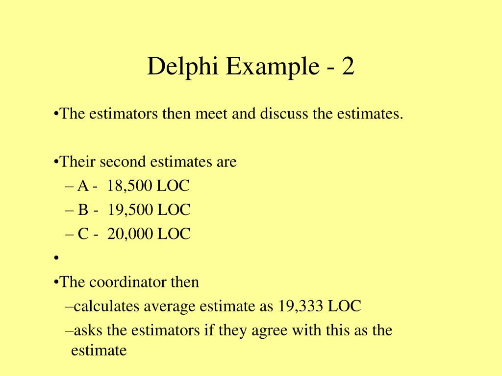 Delphi Example - 2 • The estimators then meet and discuss the estimates. • Their second estimates are • A - 18,500 LOC • B - 19,500 LOC • C - 20,000 LOC • The coordinator then • calculates average estimate as 19,333 LOC • asks the estimators if they agree with this as the estimate
