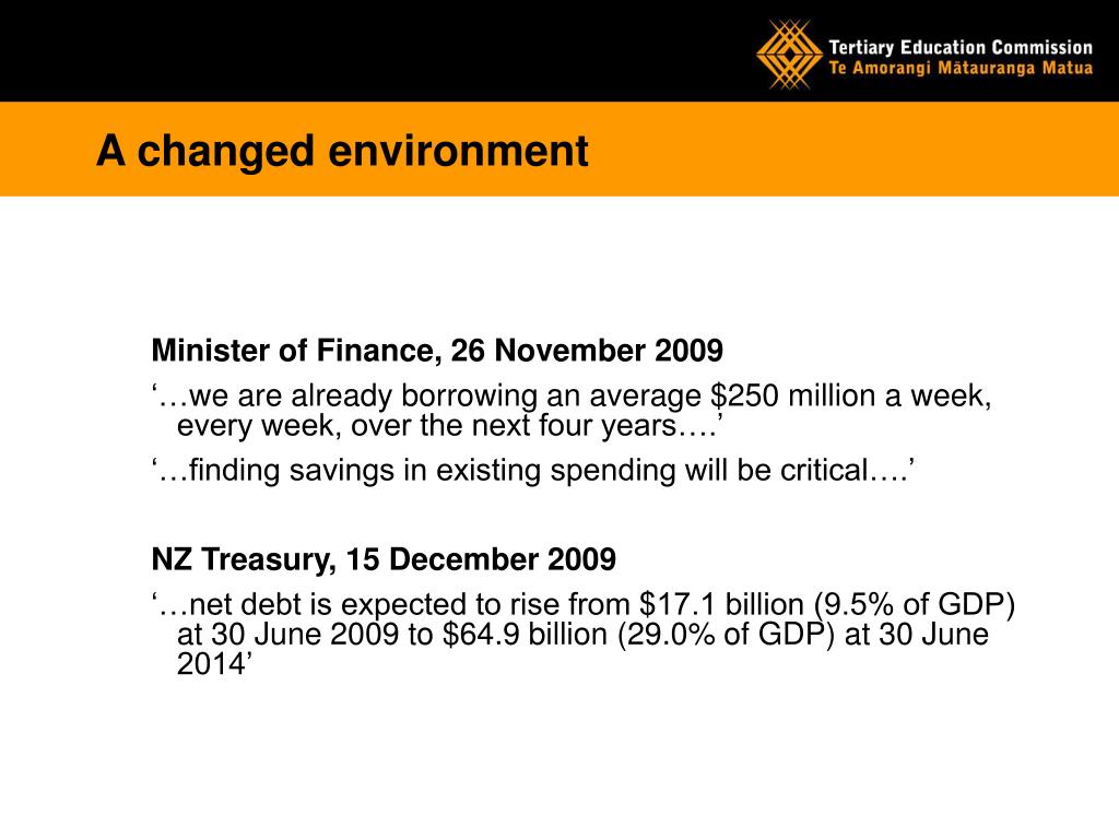 Industry Training Register. Context and opportunities. A changed environment. Minister of Finance, 26 November 2009 ‘… we are already borrowing an average $250 million a week, every week, over the next four years….’ ‘…finding savings in existing spending will be critical….’