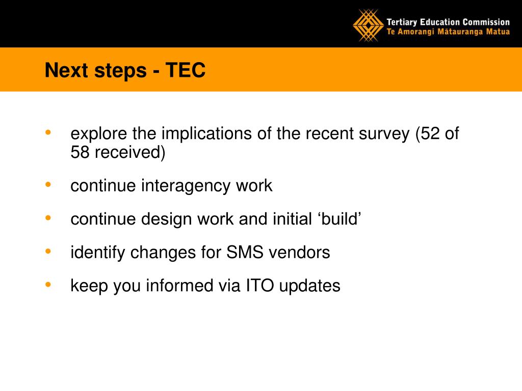 Next steps - TEC • explore the implications of the recent survey (52 of 58 received) • continue interagency work • continue design work and initial ‘build’ • identify changes for SMS vendors • keep you informed via ITO updates