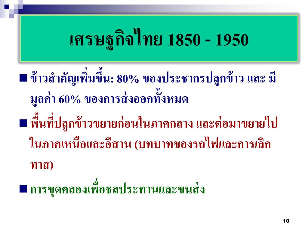 เศรษฐกิจไทย 1850 - 1950 • ข้าวสำคัญเพิ่มขึ้น: 80% ของประชากรปลูกข้าว และ มีมูลค่า 60% ของการส่งออกทั้งหมด • พื้นที่ปลูกข้าวขยายก่อนในภาคกลาง และต่อมาขยายไปในภาคเหนือและอีสาน (บทบาทของรถไฟและการเลิกทาส) • การขุดคลองเพื่อชลประทานและขนส่ง