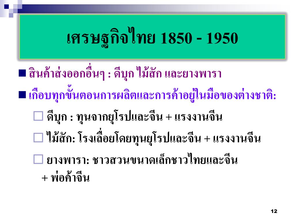 เศรษฐกิจไทย 1850 - 1950 • สินค้าส่งออกอื่นๆ : ดีบุก ไม้สัก และยางพารา • เกือบทุกขั้นตอนการผลิตและการค้าอยู่ในมือของต่างชาติ: • ดีบุก : ทุนจากยุโรปและจีน + แรงงานจีน • ไม้สัก: โรงเลื่อยโดยทุนยุโรปและจีน + แรงงานจีน • ยางพารา: ชาวสวนขนาดเล็กชาวไทยและจีน + พ่อค้าจีน