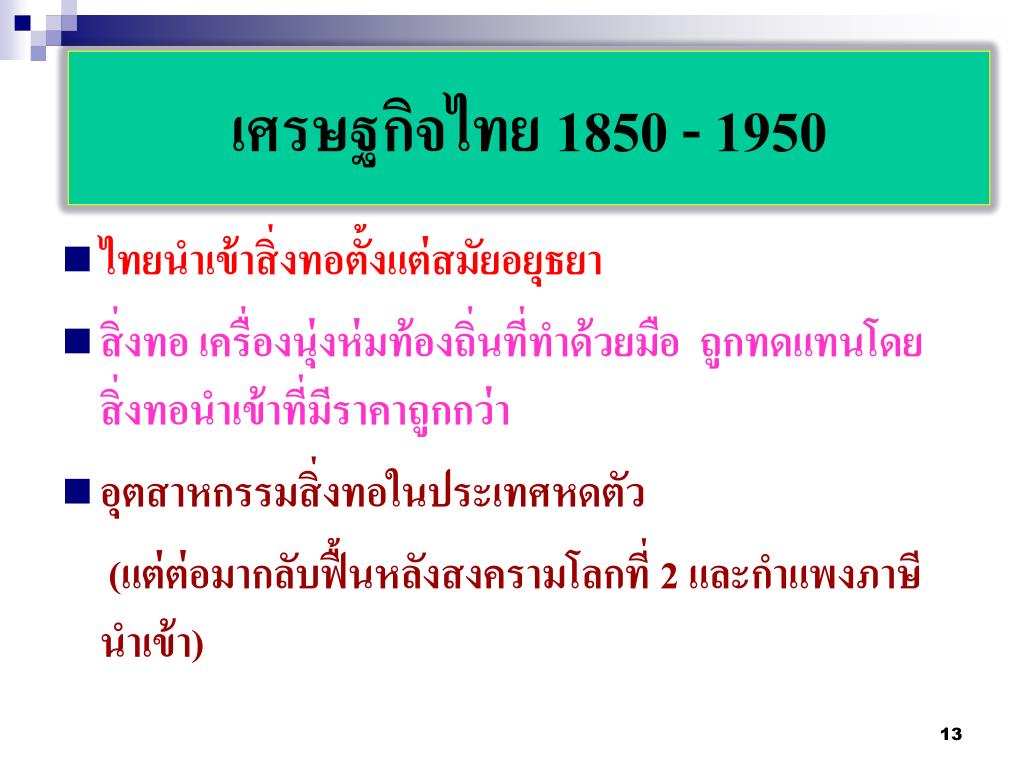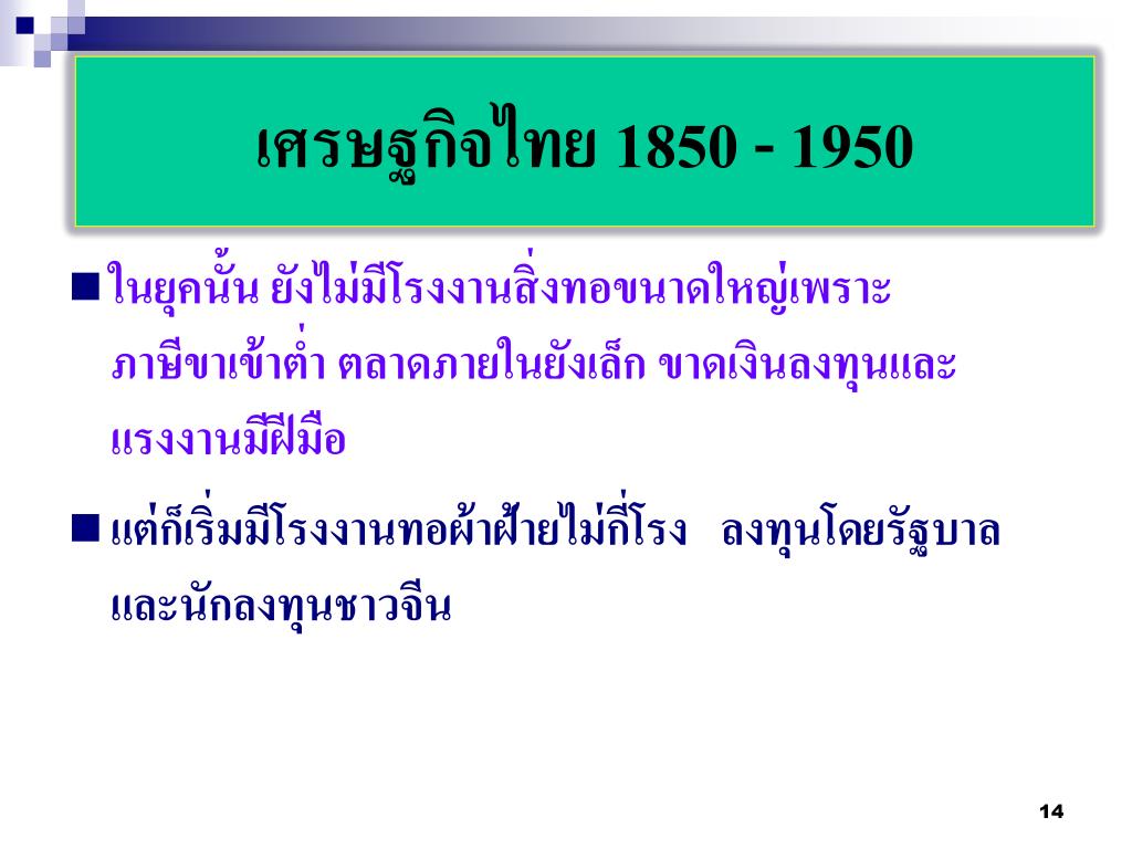 เศรษฐกิจไทย 1850 - 1950 • ไทยนำเข้าสิ่งทอตั้งแต่สมัยอยุธยา • สิ่งทอ เครื่องนุ่งห่มท้องถิ่นที่ทำด้วยมือ ถูกทดแทนโดยสิ่งทอนำเข้าที่มีราคาถูกกว่า • อุตสาหกรรมสิ่งทอในประเทศหดตัว (แต่ต่อมากลับฟื้นหลังสงครามโลกที่ 2 และกำแพงภาษีนำเข้า)