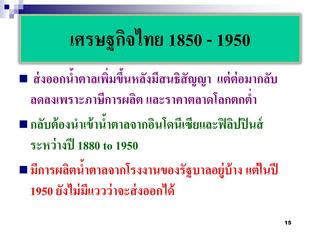 เศรษฐกิจไทย 1850 - 1950 • ส่งออกน้ำตาลเพิ่มขึ้นหลังมีสนธิสัญญา แต่ต่อมากลับลดลงเพราะภาษีการผลิต และราคาตลาดโลกตกต่ำ • กลับต้องนำเข้าน้ำตาลจากอินโดนีเซียและฟิลิปปินส์ ระหว่างปี 1880 to 1950 • มีการผลิตน้ำตาลจากโรงงานของรัฐบาลอยู่บ้าง แต่ในปี 1950 ยังไม่มีแววว่าจะส่งออกได้