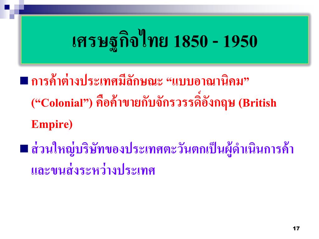 เศรษฐกิจไทย 1850 - 1950 • การค้าต่างประเทศมีลักษณะ “แบบอาณานิคม” (“Colonial”) คือค้าขายกับจักรวรรดิ์อังกฤษ (British Empire) • ส่วนใหญ่บริษัทของประเทศตะวันตกเป็นผู้ดำเนินการค้าและขนส่งระหว่างประเทศ