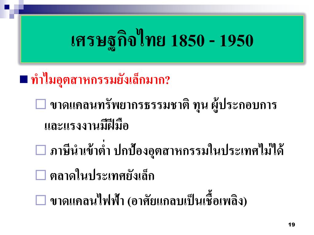 เศรษฐกิจไทย 1850 - 1950 • ทำไมอุตสาหกรรมยังเล็กมาก? • ขาดแคลนทรัพยากรธรรมชาติ ทุน ผู้ประกอบการ และแรงงานมีฝีมือ • ภาษีนำเข้าต่ำ ปกป้องอุตสาหกรรมในประเทศไม่ได้ • ตลาดในประเทศยังเล็ก • ขาดแคลนไฟฟ้า (อาศัยแกลบเป็นเชื้อเพลิง)