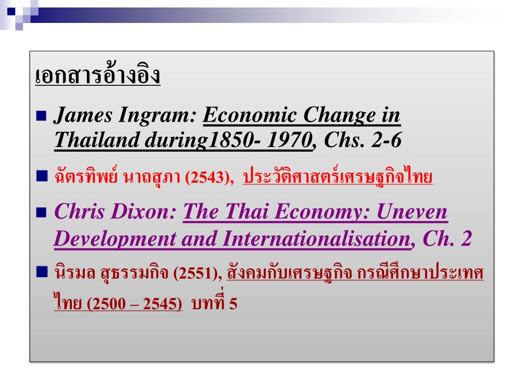 เอกสารอ้างอิง • James Ingram: Economic Change in Thailand during1850- 1970, Chs. 2-6 • ฉัตรทิพย์ นาถสุภา (2543), ประวัติศาสตร์เศรษฐกิจไทย • Chris Dixon: The Thai Economy: Uneven Development and Internationalisation, Ch. 2 • นิรมล สุธรรมกิจ (2551), สังคมกับเศรษฐกิจ กรณีศึกษาประเทศไทย (2500 – 2545) บทที่ 5