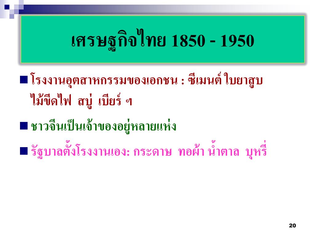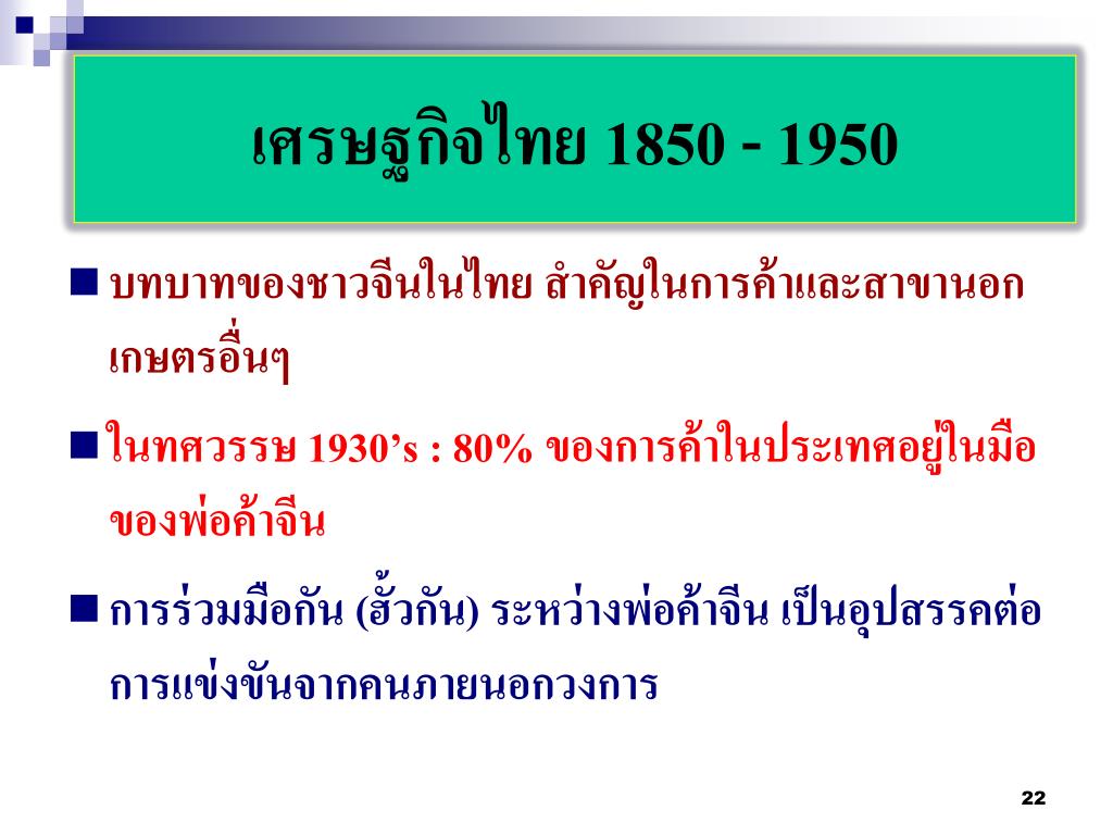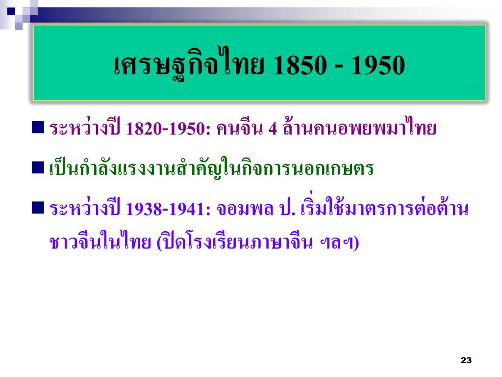 เศรษฐกิจไทย 1850 - 1950 • ระหว่างปี 1820-1950: คนจีน 4 ล้านคนอพยพมาไทย • เป็นกำลังแรงงานสำคัญในกิจการนอกเกษตร • ระหว่างปี 1938-1941: จอมพล ป. เริ่มใช้มาตรการต่อต้านชาวจีนในไทย (ปิดโรงเรียนภาษาจีน ฯลฯ)
