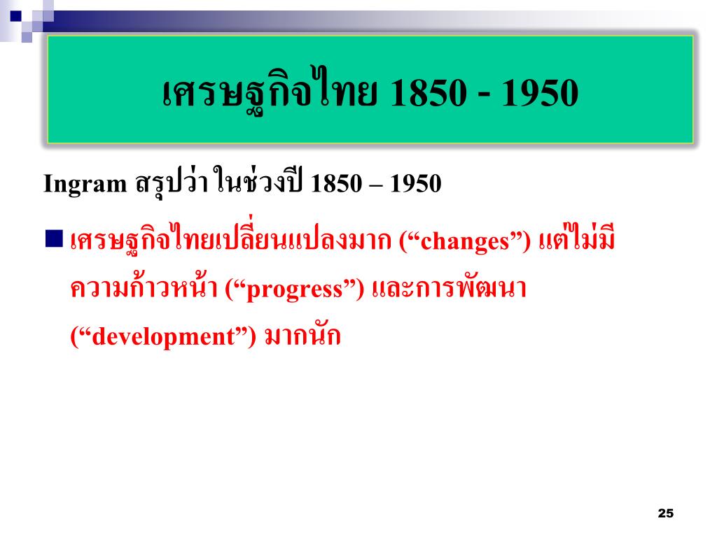 เศรษฐกิจไทย 1850 - 1950 Ingram สรุปว่า ในช่วงปี 1850 – 1950 • เศรษฐกิจไทยเปลี่ยนแปลงมาก(“changes”) แต่ไม่มีความก้าวหน้า (“progress”) และการพัฒนา(“development”) มากนัก