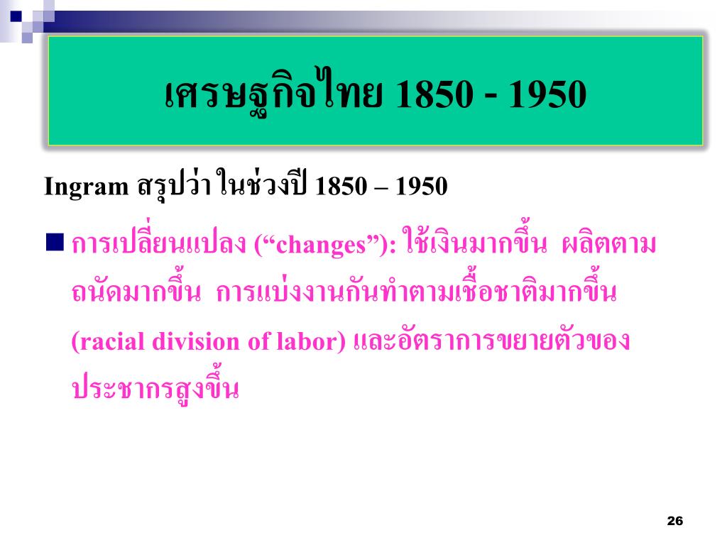 เศรษฐกิจไทย 1850 - 1950 Ingram สรุปว่า ในช่วงปี 1850 – 1950 • การเปลี่ยนแปลง (“changes”): ใช้เงินมากขึ้น ผลิตตามถนัดมากขึ้น การแบ่งงานกันทำตามเชื้อชาติมากขึ้น (racial division of labor) และอัตราการขยายตัวของประชากรสูงขึ้น