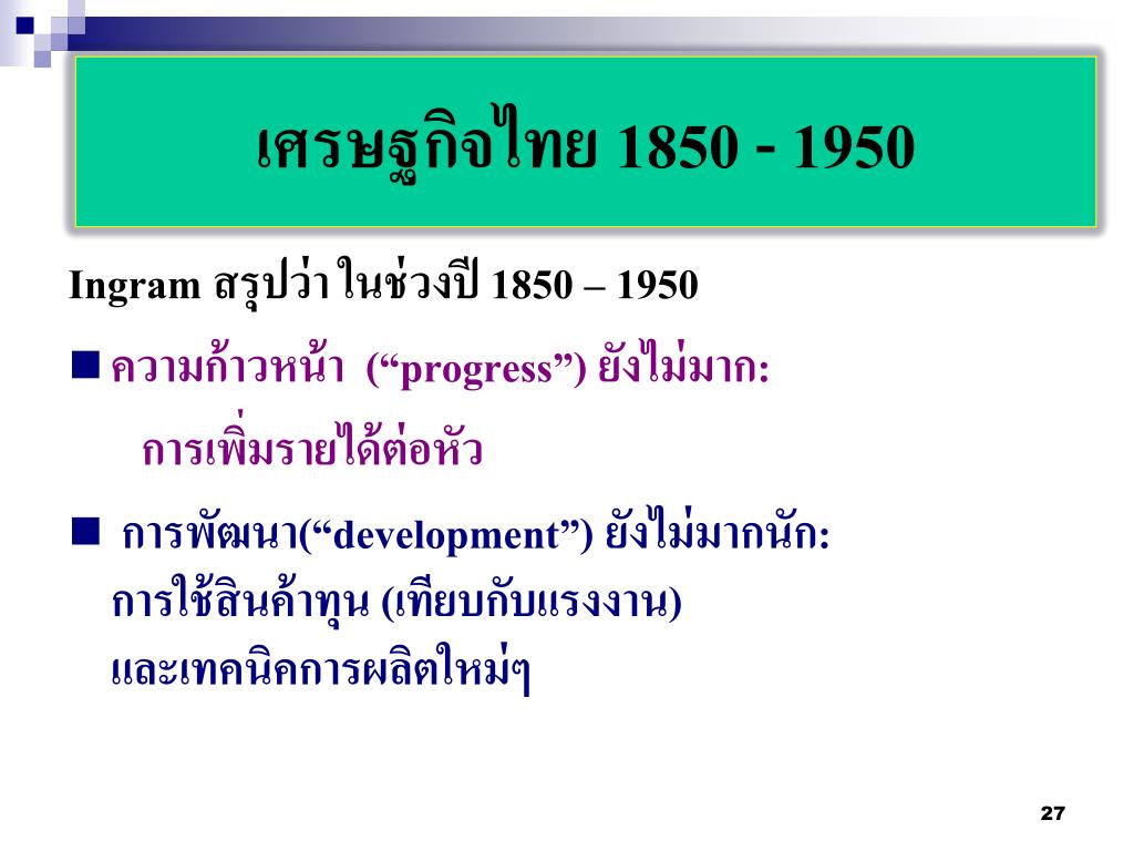 เศรษฐกิจไทย 1850 - 1950 Ingram สรุปว่า ในช่วงปี 1850 – 1950 • ความก้าวหน้า (“progress”)ยังไม่มาก: การเพิ่มรายได้ต่อหัว • การพัฒนา(“development”) ยังไม่มากนัก: การใช้สินค้าทุน (เทียบกับแรงงาน) และเทคนิคการผลิตใหม่ๆ
