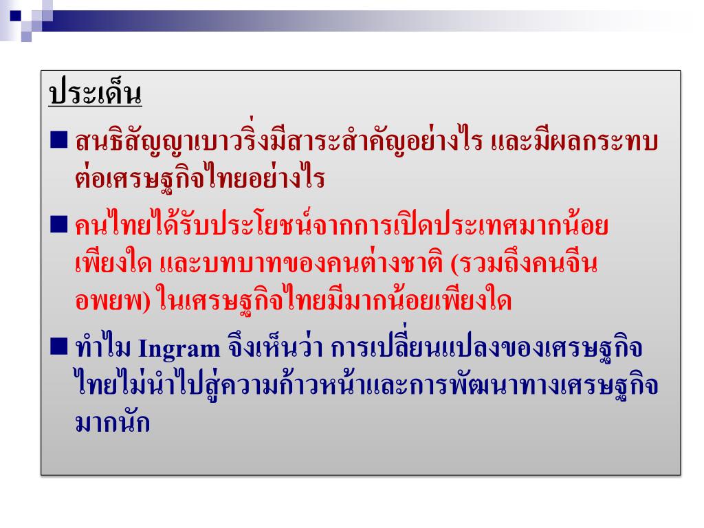 ประเด็น สนธิสัญญาเบาวริ่งมีสาระสำคัญอย่างไร และมีผลกระทบต่อเศรษฐกิจไทยอย่างไร คนไทยได้รับประโยชน์จากการเปิดประเทศมากน้อยเพียงใด และบทบาทของคนต่างชาติ (รวมถึงคนจีนอพยพ) ในเศรษฐกิจไทยมีมากน้อยเพียงใด ทำไม Ingram จึงเห็นว่า การเปลี่ยนแปลงของเศรษฐกิจไทยไม่นำไปสู่ความก้าวหน้าและการพัฒนาทางเศรษฐกิจมากนัก
