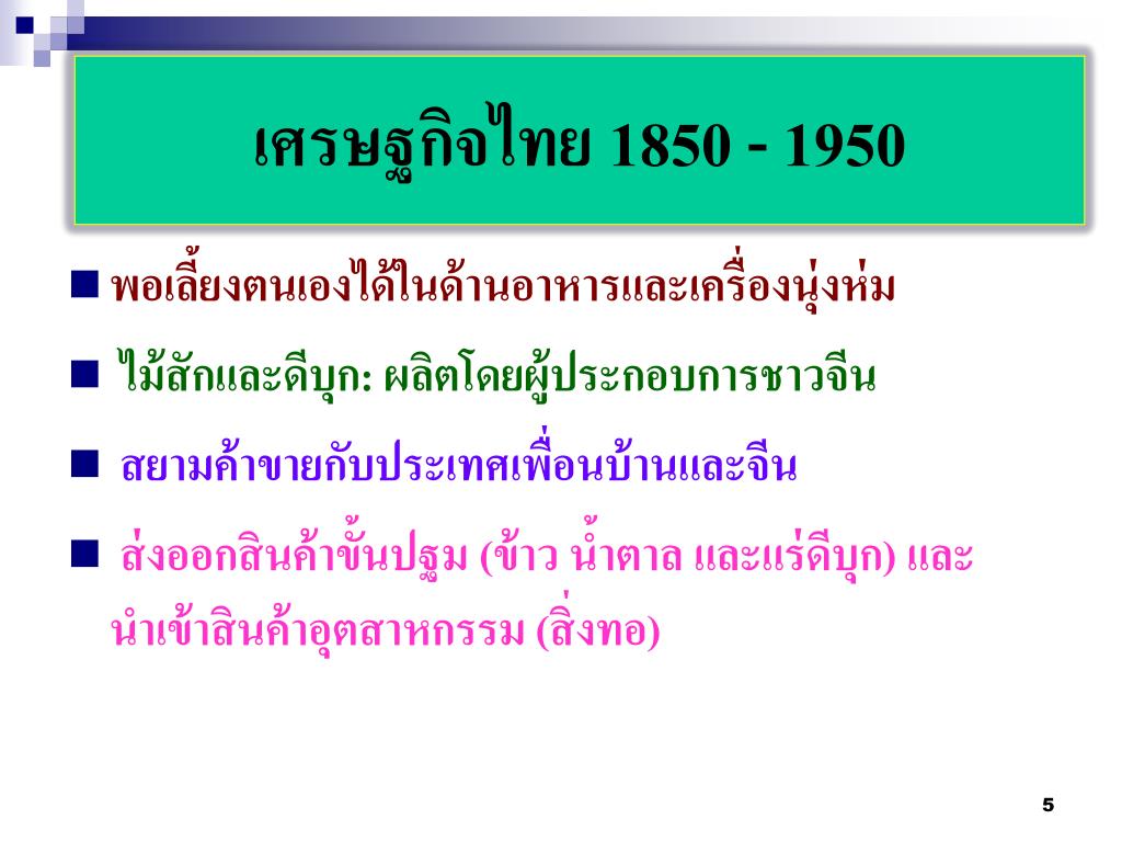 เศรษฐกิจไทย 1850 - 1950 • พอเลี้ยงตนเองได้ในด้านอาหารและเครื่องนุ่งห่ม • ไม้สักและดีบุก: ผลิตโดยผู้ประกอบการชาวจีน • สยามค้าขายกับประเทศเพื่อนบ้านและจีน • ส่งออกสินค้าขั้นปฐม (ข้าว น้ำตาล และแร่ดีบุก) และนำเข้าสินค้าอุตสาหกรรม (สิ่งทอ)