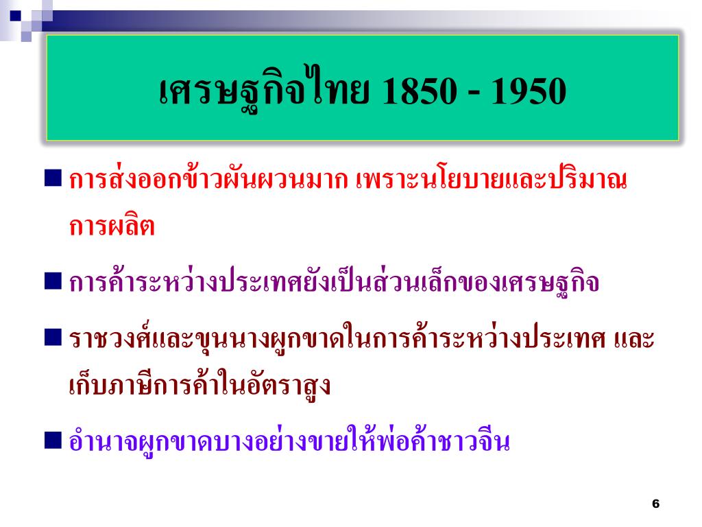 เศรษฐกิจไทย 1850 - 1950 • การส่งออกข้าวผันผวนมาก เพราะนโยบายและปริมาณการผลิต • การค้าระหว่างประเทศยังเป็นส่วนเล็กของเศรษฐกิจ • ราชวงศ์และขุนนางผูกขาดในการค้าระหว่างประเทศ และเก็บภาษีการค้าในอัตราสูง • อำนาจผูกขาดบางอย่างขายให้พ่อค้าชาวจีน