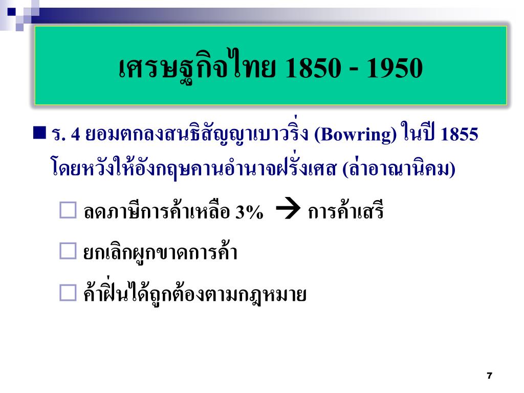 เศรษฐกิจไทย 1850 - 1950 • ร. 4 ยอมตกลงสนธิสัญญาเบาวริ่ง (Bowring) ในปี 1855 โดยหวังให้อังกฤษคานอำนาจฝรั่งเศส (ล่าอาณานิคม) • ลดภาษีการค้าเหลือ 3% การค้าเสรี • ยกเลิกผูกขาดการค้า • ค้าฝิ่นได้ถูกต้องตามกฎหมาย
