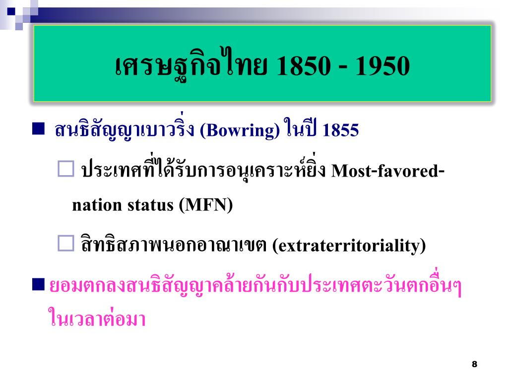 เศรษฐกิจไทย 1850 - 1950 • สนธิสัญญาเบาวริ่ง (Bowring) ในปี 1855 • ประเทศที่ได้รับการอนุเคราะห์ยิ่ง Most-favored-nation status(MFN) • สิทธิสภาพนอกอาณาเขต (extraterritoriality) • ยอมตกลงสนธิสัญญาคล้ายกันกับประเทศตะวันตกอื่นๆ ในเวลาต่อมา