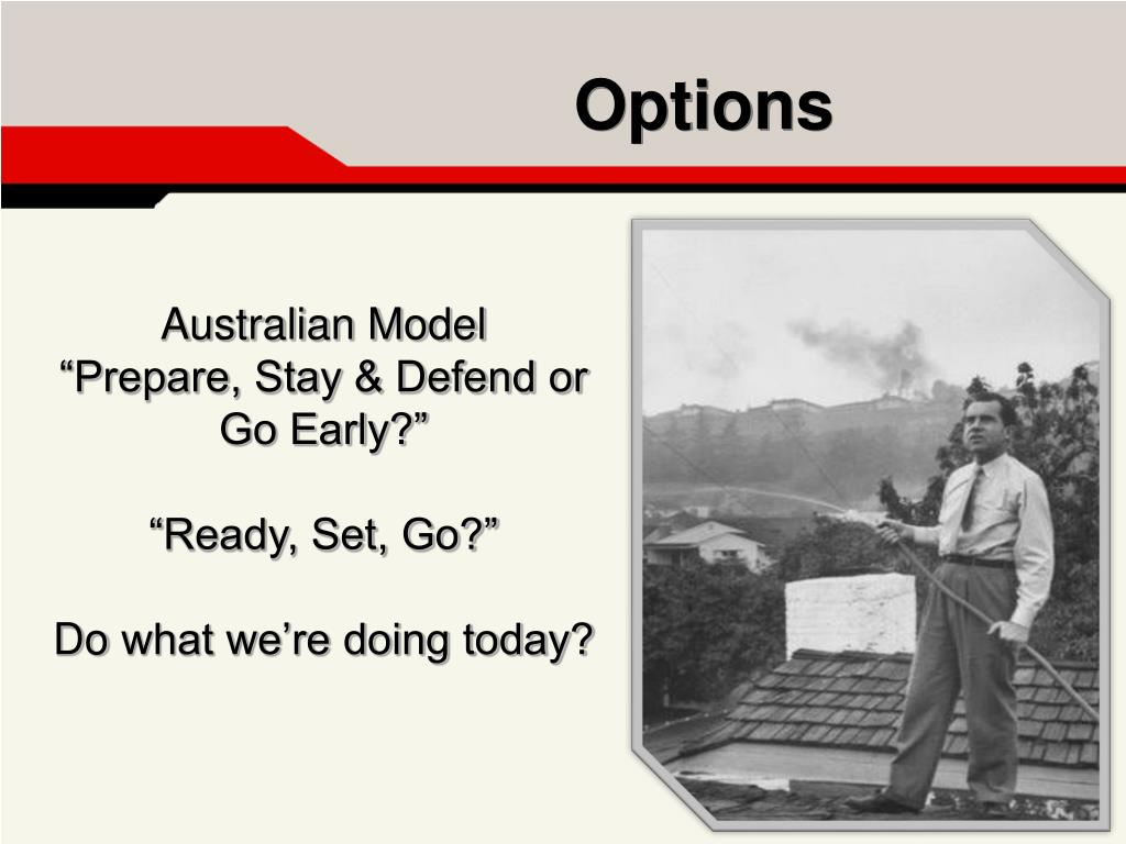 Options • Australian Model • “Prepare, Stay & Defend or Go Early?” • “Ready, Set, Go?” • Do what we’re doing today?