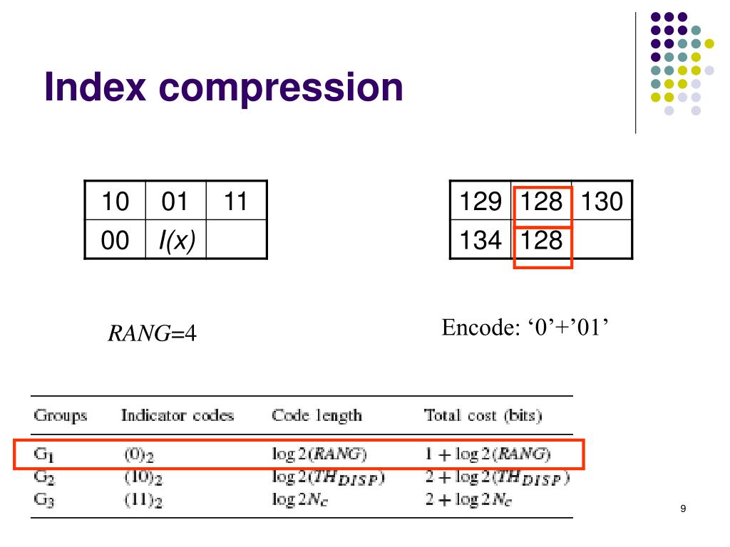 Experimental results Comparative storage cost (unit: bits) of the proposed scheme (PS) and the proposed scheme without index compression (PS').