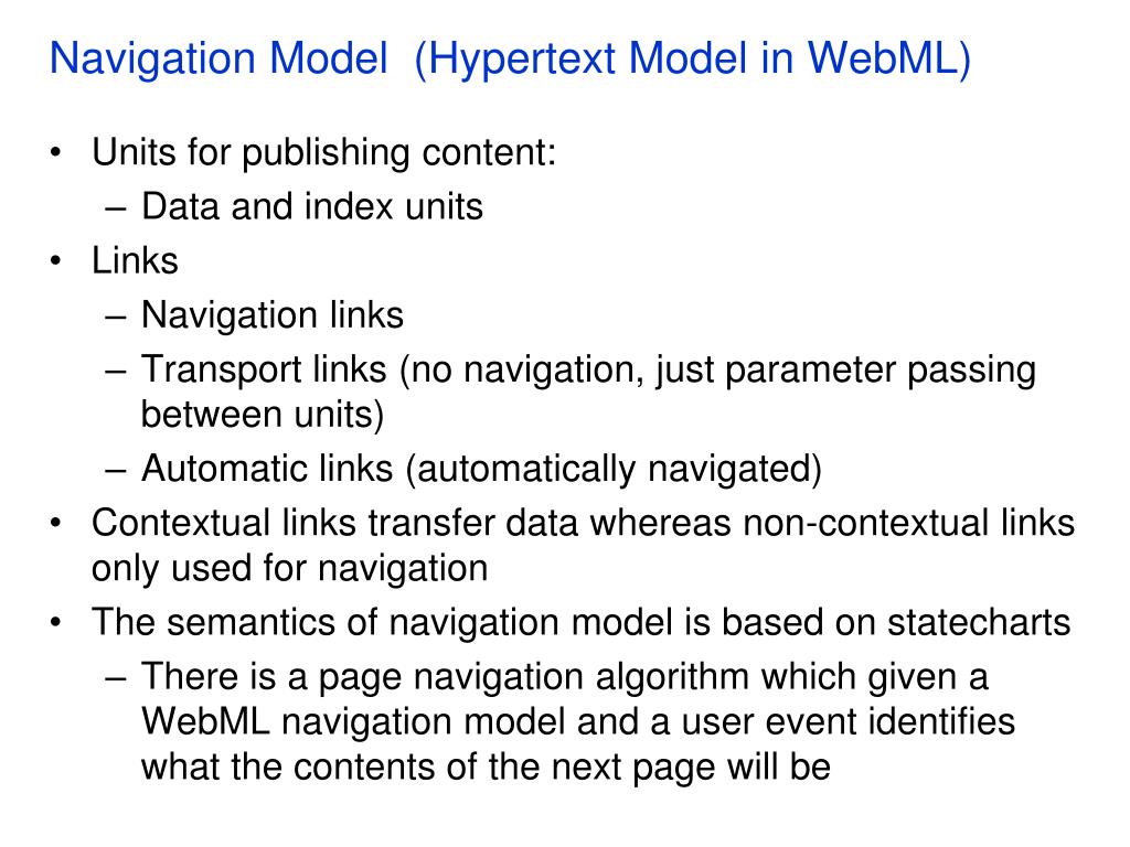 Navigation Model (Hypertext Model in WebML) • Units for publishing content: • Data and index units • Links • Navigation links • Transport links (no navigation, just parameter passing between units) • Automatic links (automatically navigated) • Contextual links transfer data whereas non-contextual links only used for navigation • The semantics of navigation model is based on statecharts • There is a page navigation algorithm which given a WebML navigation model and a user event identifies what the contents of the next page will be