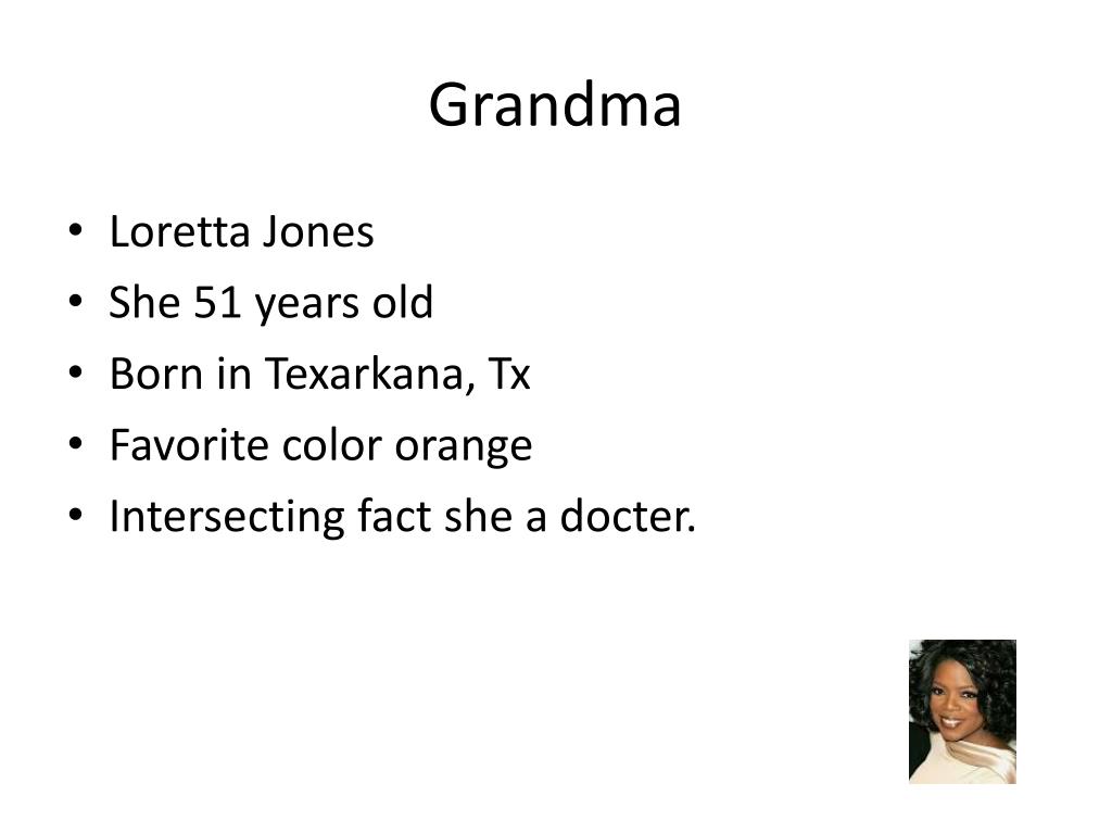 Grandma • Loretta Jones • She 51 years old • Born in Texarkana, Tx • Favorite color orange • Intersecting fact she a docter.