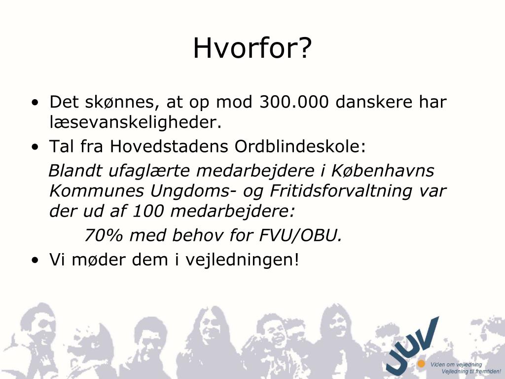 Hvorfor? • Det skønnes, at op mod 300.000 danskere har læsevanskeligheder. • Tal fra Hovedstadens Ordblindeskole: Blandt ufaglærte medarbejdere i Københavns Kommunes Ungdoms- og Fritidsforvaltning var der ud af 100 medarbejdere: 70% med behov for FVU/OBU. • Vi møder dem i vejledningen!