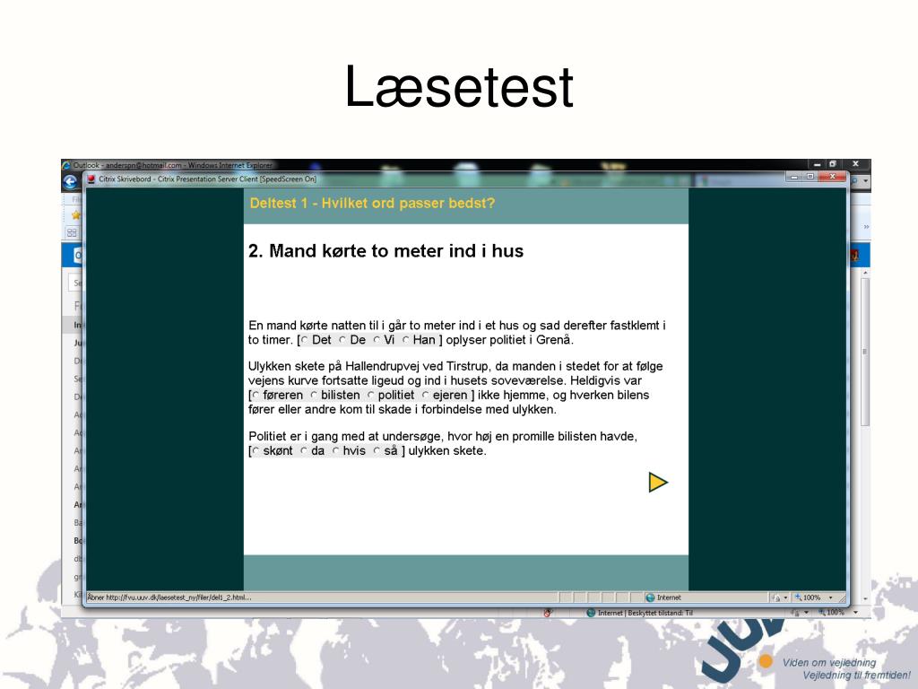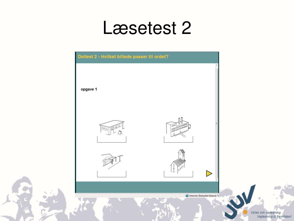 Vejledende læsetest for voksne • Testen er udarbejdet af UVM til uddannelsesudbydere, jobcentre og andre aktører. • 3 deltest: 1) tekstforståelse 2) ordforråd 3) læsning af ord Ca. 30 minutter, typisk på computer.