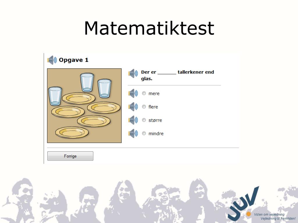Matematiktesten 3 deltest: 1) matematiske begreber 2) grundlæggende regnefærdigheder 3) matematik Ca. 20 minutter, på computer.